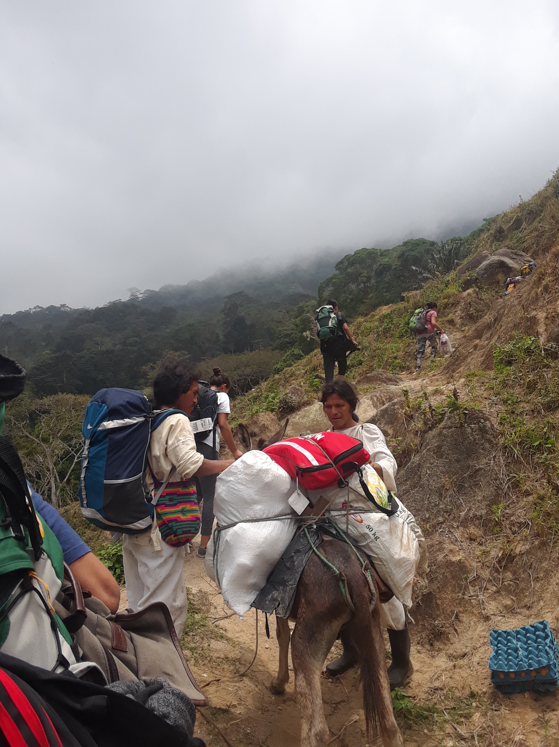 We survived the 3-hour hike! Everyone had an awesome attitude and was willing to step up and help others carry things as needed. In the morning, we got a little nervous about how we were going to carry everything (backpacks, carry-on bags, food, etc.) up the mountain when only one Kogi man showed up at our place, but sure enough, God brought us a donkey, two other Kogi men, and then another man with a second donkey! We are so thankful for the ways God has been taking care of us and reminding us that He’s got it all under control.