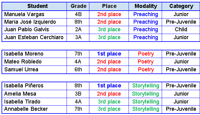 Every year the Christian school Beth Shalom organizes a Speech Contest, where several Christian schools send representatives to present in the categories of preaching, storytelling, and poetry. The purpose of this event is to promote student oratory skills. Each school can send two preselected representatives from each category and modality.