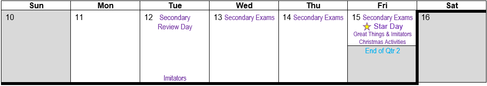 • Wed-Thu, Dec 13-14 are full days of class. PK-6th graders will have normal classes.