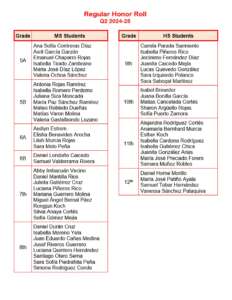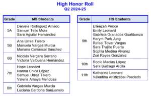 The following secondary students achieved either High or Regular Academic Honor Roll during 2nd Quarter. For High Honor Roll, the numeric average of the six core subjects needs to be 95 or above (no rounding), with no grade below 80. For Regular Honor Roll, the numeric average of the six core subjects needs to be 90 or above, again with no rounding or grade below 80. Congratulations!