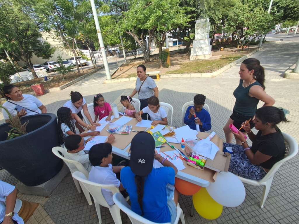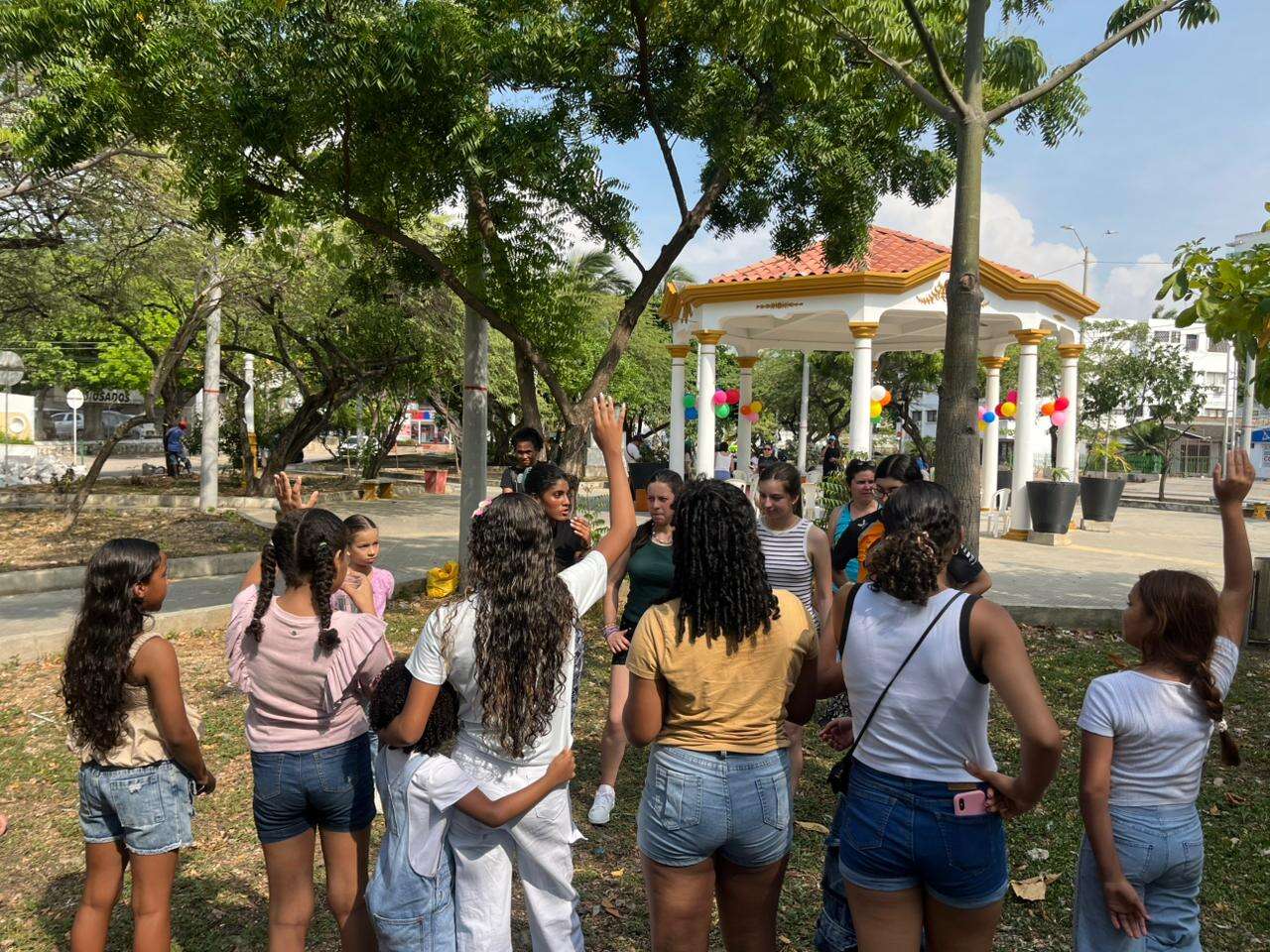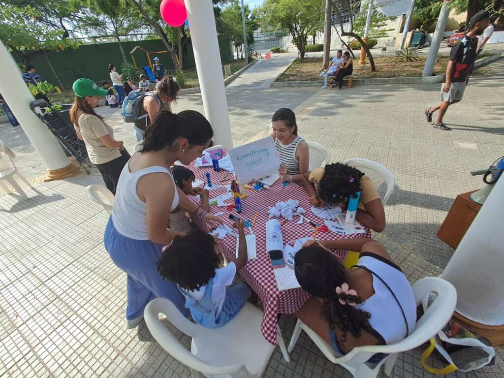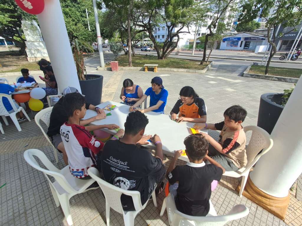 Martin: After 2:30PM we decorated the park with balloons, brought the chairs and the tables to use for the stations and welcomed the kids as they arrived. We had 4 stations: games, crafts, English, and Bible stories and the children rotated through. We sang and danced with them before starting the play which was about Psalms 23 with a reflection and some prayer. At 5:30PM we shared testimonies and led a discussion with the youth. We had some time to hang out and be with them.